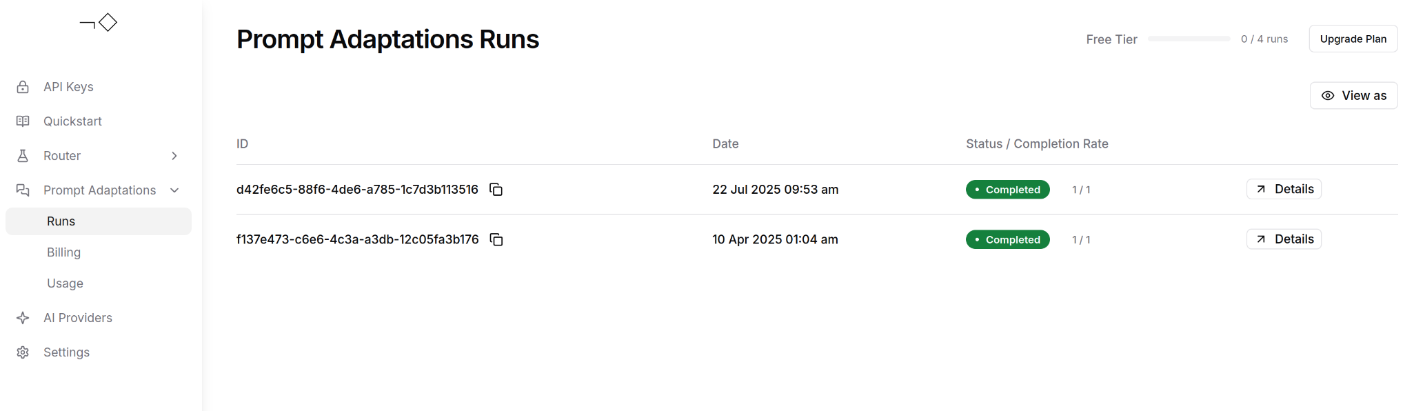 View your prompt adaptation requests and results